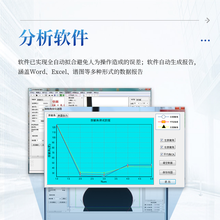分析软件功能强大 ,具备一键式全自动拟合能力 ,具备拟合方法 ,满足各 种液滴形态的精确拟合;
